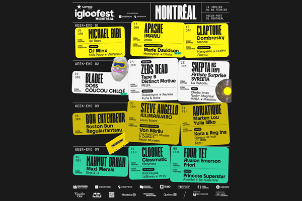 As the final weekend approaches, Turkish star Mahmut Orhan and Belgian producer Maxi Meraki will take the stage on Thursday, February 6, for a warm, festive night. Friday, February 7, the spotlight shines on Cloonee, who skillfully wanders through the most frenzied house repertoire, as does Brazilian Classmatic, also taking part. The grand finale? Four Tet, with whom Igloofest audiences have an undying love affair. The man who almost lost his fingers there in 2019 will be back to close this 17th edition with class and magic, not to mention the irresistible charm of Avalon Emerson, who will also be part of the festival’s last night.