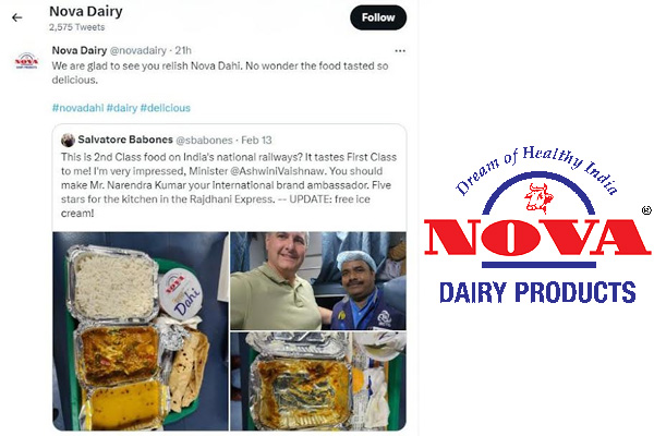 MUMBAI: Salvatore Babones, a well-known sociologist from the United States, recently praised the Indian Railway Catering and Tourism Corporation (IRCTC) and Nova Dairy for their premium Nova Dahi, which was a component of his meal on the Rajdhani Express. Mr. Babones, who is renowned for his work and viewpoints on the global economy, particularly those of former US president Donald Trump, recently traveled on the Rajdhani Express and praised the top-notch food and welcoming environment provided by the IRCTC.