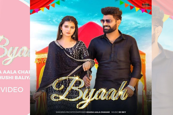 The music Video of “Byaah,” is directed by Deepesh Goyal and is sung, written, and composed by Khasa Aala Chahar. The video features Khushi Baliyan and Khasa at a wedding setting where they fall in love at first sight. Video portrays a cute chemistry between the protagonists in a new blossoming relationship.
