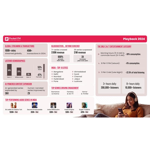 MUMBAI: Audio series platform Pocket FM today announces its 2024 app consumption insights through Pocket FM Playback 2024, offering an in-depth look at how the world embraced storytelling and immersive audio experiences over the year. This report celebrates a landmark year of record-breaking engagement and revenue, driven by an ever-expanding content library and a passionate global audience.