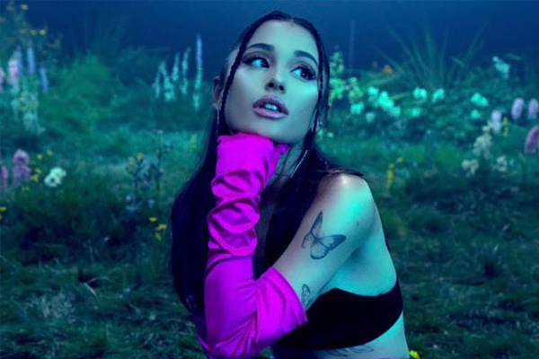 The visual kicks off with the singer’s silhouette highlighted by a bright light behind her figure. Standing in a field of lush green grass and colorful wildflowers, Grande delivers the third single from her sixth studio album, 2020’s Positions.