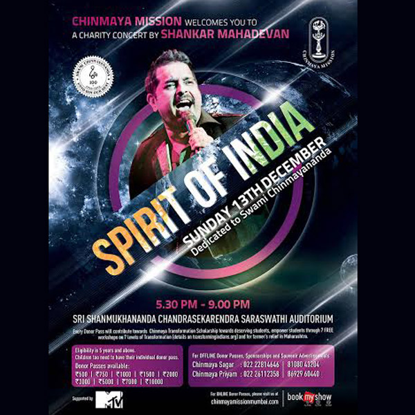 ‘Spirit of India’ is a charity concert aimed to raise funds for conducting free workshops on ‘Transforming Indians to Transform India’ in schools and colleges for students from sixth standard till graduation. 900 workshops have already been conducted impacting about 60,000 students. The proceeds will also be used to offer Chinmaya Transformation Scholarships to deserving students for education and also towards the Jalyukt Shivar Abhiyaan for farmer’s relief in Maharashtra.